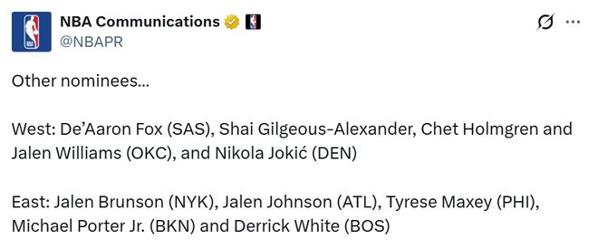西部:福克斯(马刺)、亚历山大、霍姆格伦、杰伦-威廉姆斯(雷霆)、约基奇(掘金)