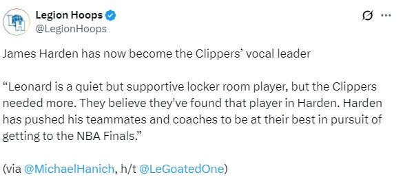 Michael Hanich在文章中报道,如今詹姆斯-哈登已经成为快船队更衣室的发声领袖,莱昂纳德在更衣室是一位沉默但支持队友的球员,但快船需要更多,他们相信哈登身上有这样的特质,为了冲击总决赛,哈登已经推动他的队友和教练发挥出最佳状态。