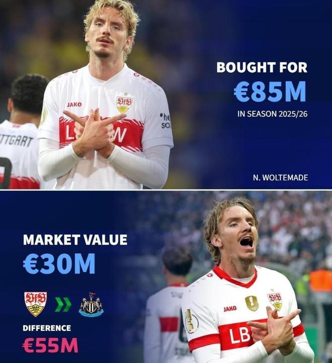 《德转》甚至把沃尔特马德转会纽卡,列为今夏转会市场上,溢价最多的引援交易,可见外界对于这位德国前锋其实并不看好。