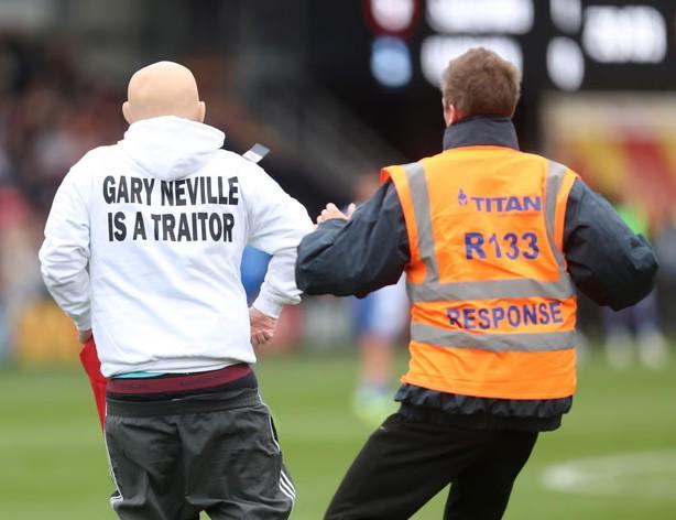 两男子穿着印有“加里-内维尔是叛徒”的衣服,冲入英乙赛场